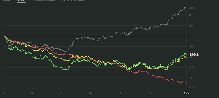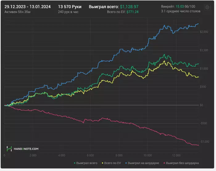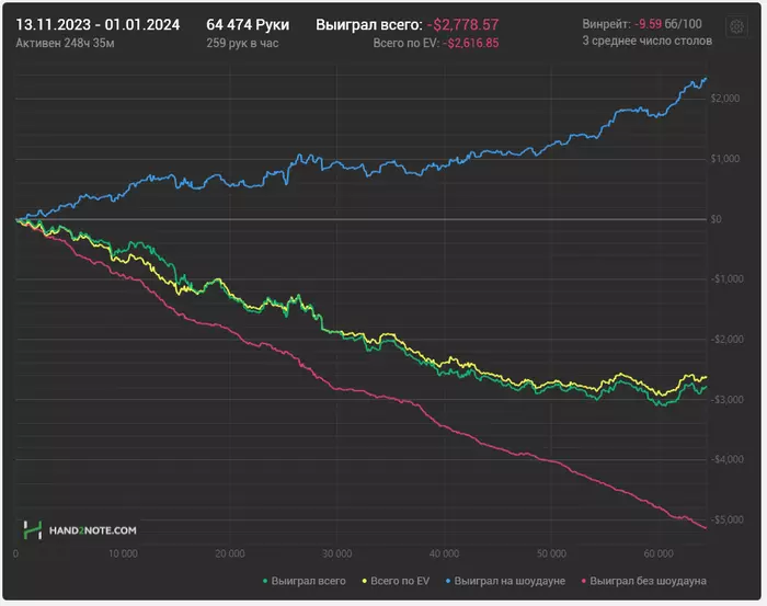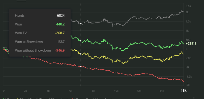 Но все не зря. Пошел в Джуниор, и вскрылся такой огромный пласт проблем в игре, что я в шоке как я не мог это заметить раньше. Начал практически заново. И банкрол-билдинг и покерное образование. Столько пробелов просто ужость! Сейчас пошло дело. Пробил заново нл5 и нл10. Играю 20ку на Редах, продолжаю фиксить ошибки. Винрейт пока слабый. Вот правда шел 30к рук с 10бб/100, но последние три дня играл плохо. Много ошибок причина которых в околопокерных делах. Но сейчас работаю и над этим. Планирую или попасть в основу Гринов или подойти в плотную к нл50 за месяц. А там видно будет. Ошибок делаю все меньше, но еще слишком много чтобы считать себя вставшим на рельсы.