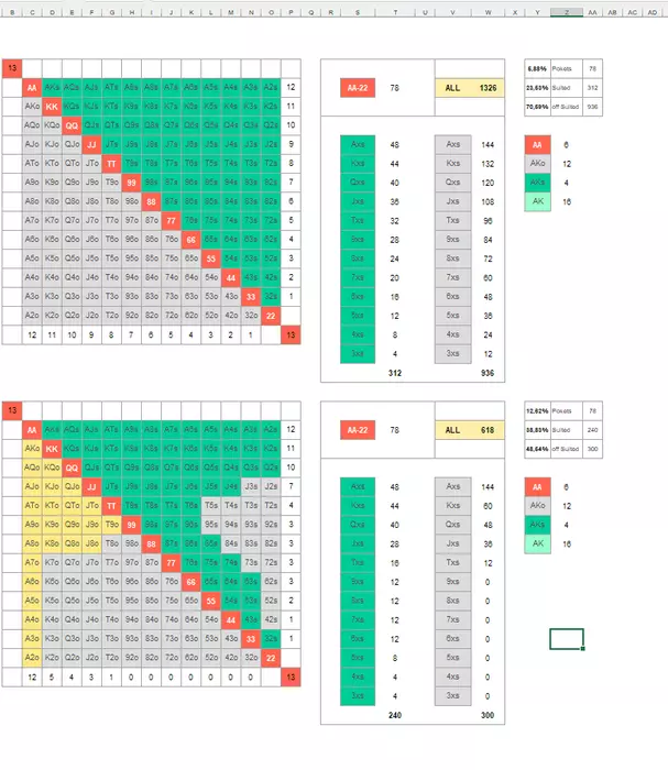 Я выписал все на бумагу. посчитал все комбнации, включая те что не должны учавствовать в раздаче, да, да, даже неготовые руки типо 72o. Всю колоду в общем.
