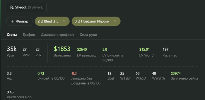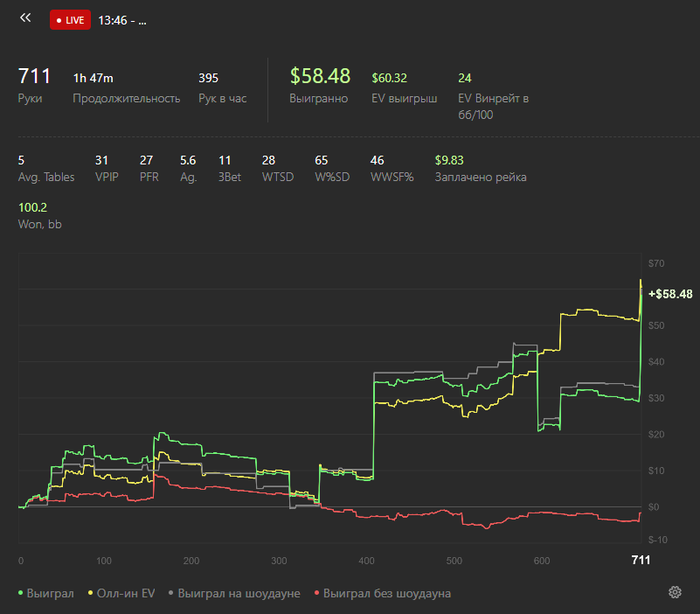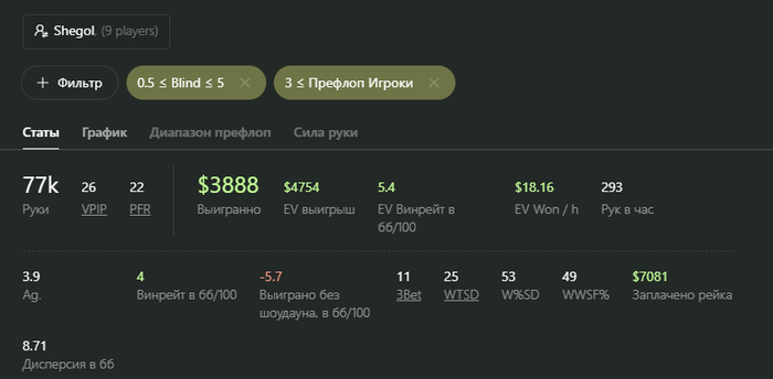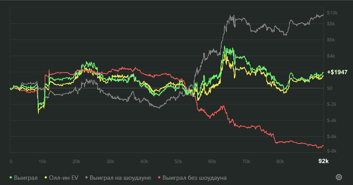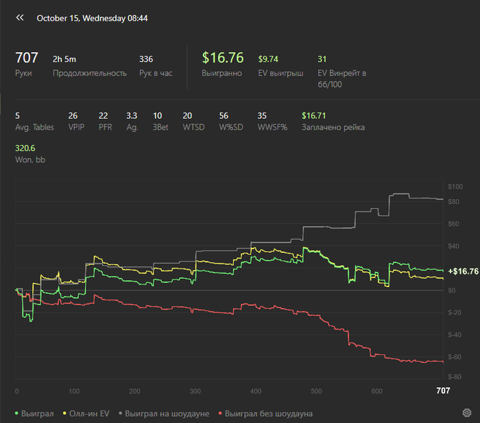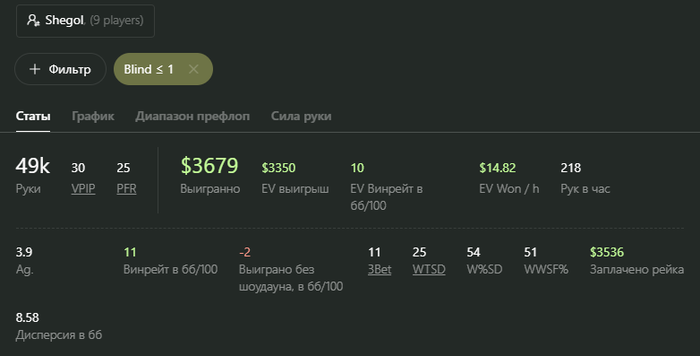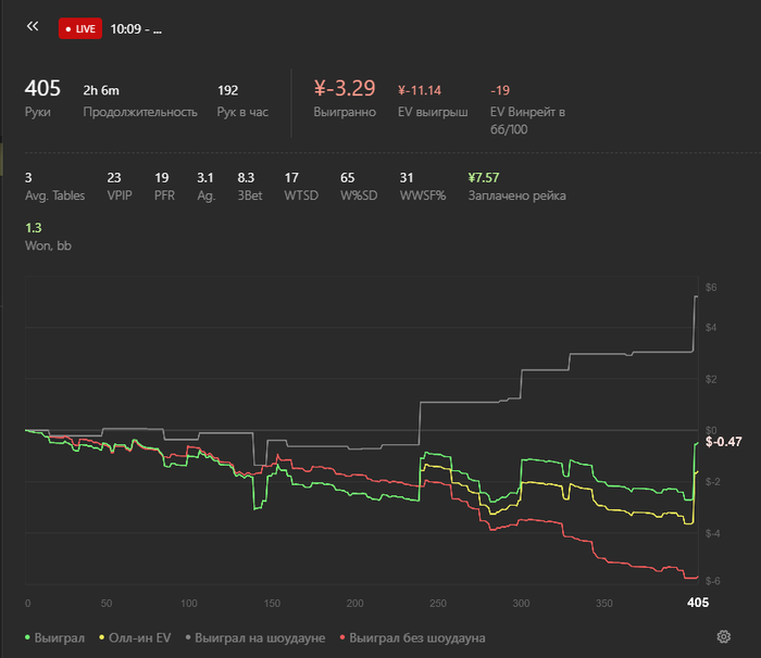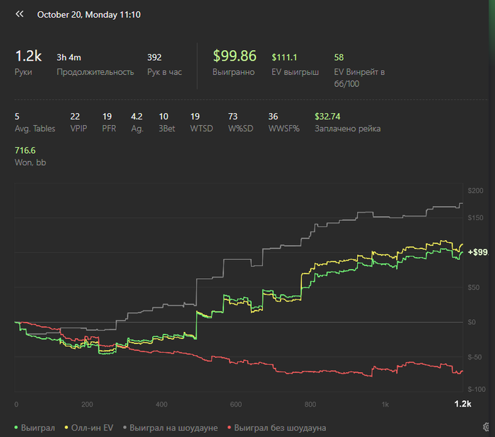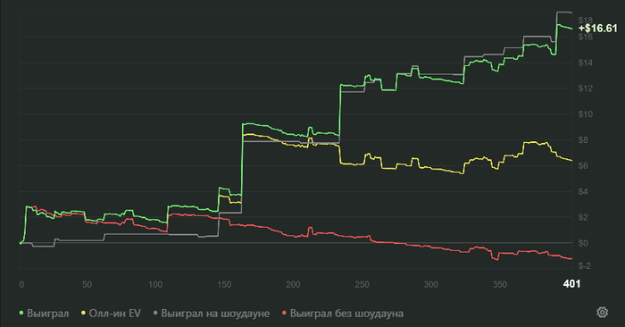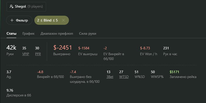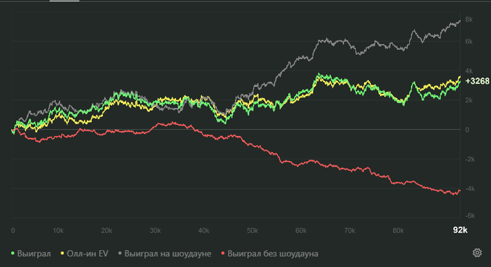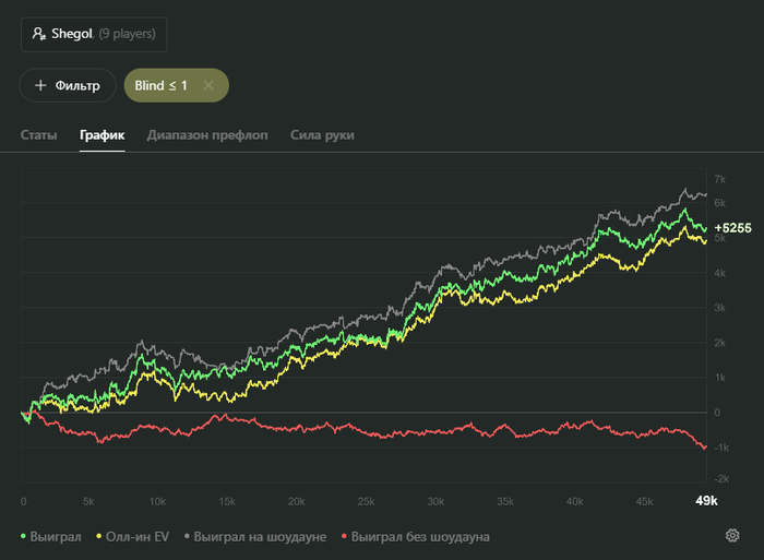 Однако меня не переставало мучить ощущение, что слил банкролл в трейдинге, и начал стабильно проигрывать в покере (все графики приложу в конце поста). При том, что стороны стратегии, как я считал, все было норм. Понятно, что можно было селектить, лучшую рыбу, играть меньше рук час, не играть ХА. Но когда за очень короткий промежуток времени ты проигрываешь, то у чего 95% на победу при выставлении. И просто перманентно ушатываешься в топ ренжа. То тебя не перестает покидать ощущение, что любое действие приравнивается к лузу. Хоть, когда мне такое говорили люди, то я отвечал, что мол просто будь спокойней, это диспа и все отдаст тебе, но когда реально оказываешься в этом, то эти умные мысли затихают и вот ты уже блефанул два раза подряд на стакан и тебя вколили. Все, ты тупо закрываешь столы крестиком, и идешь гулять.