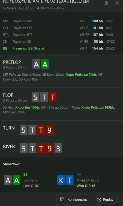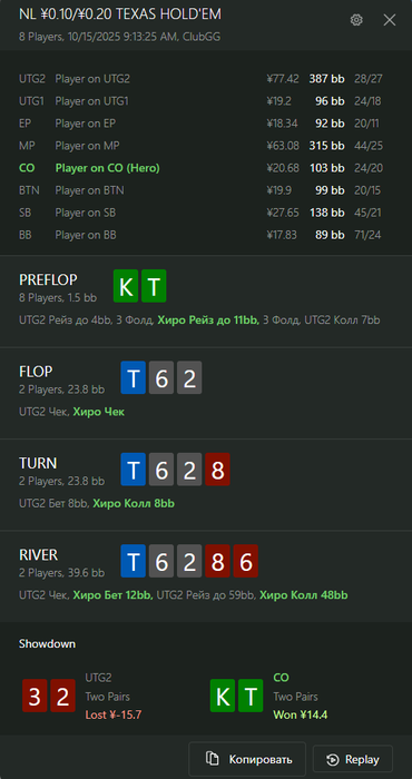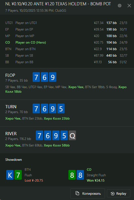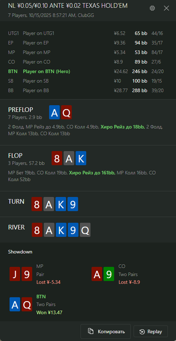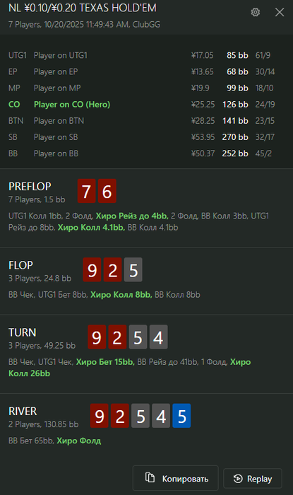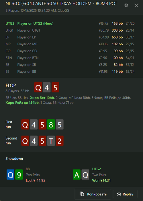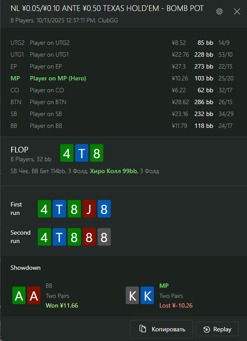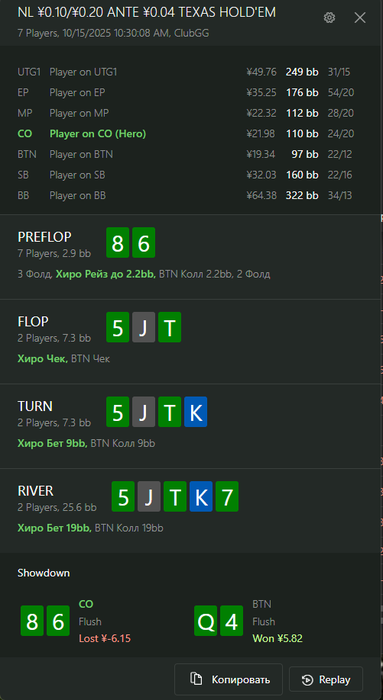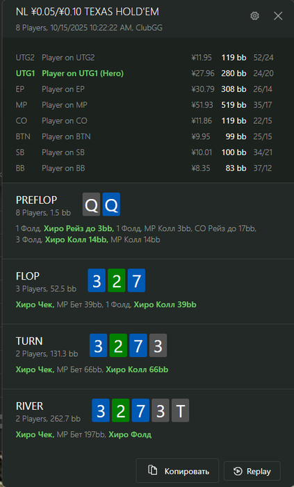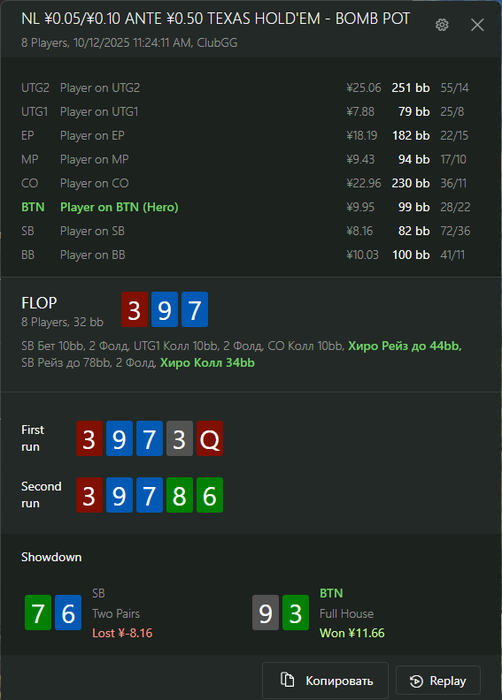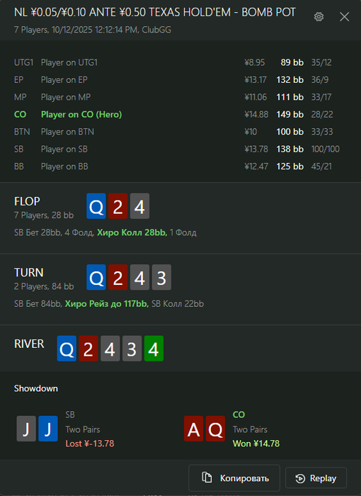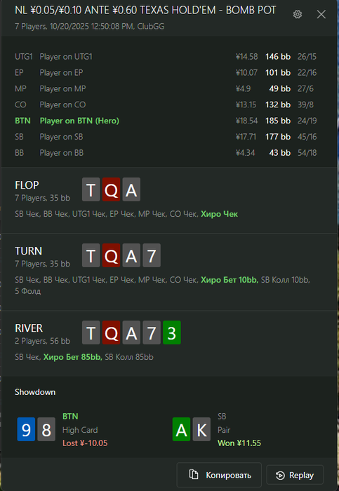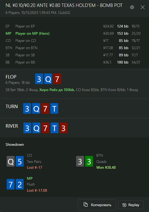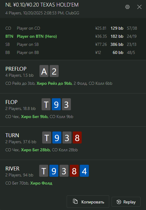 Shegol111 @ 12.10.25Доска динамичная, пол колоды тернов мне не сильно понравятся (Q,t,9,8, пика, да и туз не супер натс). Решил поставить подешевле, чтобы глянуть ранауты, если понравится, то играть дорого. Либо 75, либо ЧР. Решил 75% уже играть. И дальше уже говорил, что ошибся с выставлением.