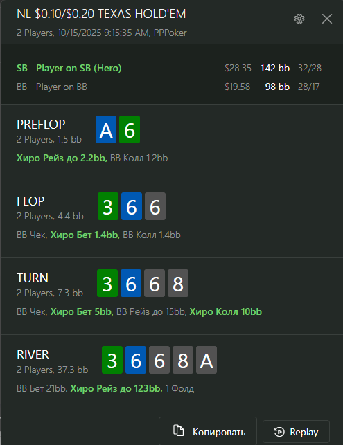Как бы выглядит все капец как дефолтно и стандартно, скажет какой-то супер умный обитатель данного форума. Однако, я хоть и сидел в солверах, сидел в обычных ресерчах, общался с людьми, обсуждал раздачи. Но регулярно использовал с сетом на флопе супер дешевые сайзы. Типа на доске K26r я с допером и натсом спокойно ставил 33, терном уже ставил овербет и ривер пушил, хотя иногда и мог сыграть подешевле, типо чтобы он пошире проколил. Но как показал расчет - это супер потери по ЕВ.