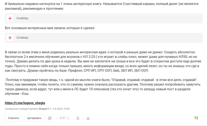 В очередной день, лежа на кровати, я понимаю, что в этой жизни надо что-то менять и так я написал прошлый пост на ГТ, который вышел 3-4 месяца назад, где я и запустил свой блок около-покера на 2 недели. Собрав немного заинтересованных людей, я начал делиться своими наработками то, что может помочь сильно изменить свою жизнь. Обязательно сам делал то, что говорил там.