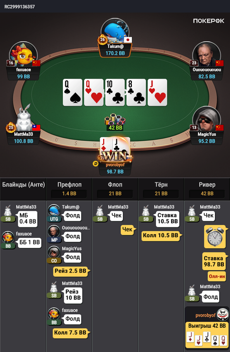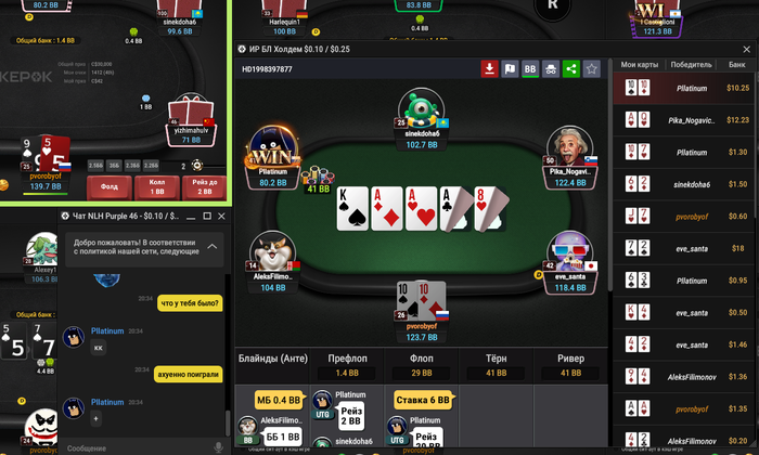 pvorobyof @ 24.10.242.2) В том-то и прикол, что пуш выглядит более простым действием без особой просадки по евшке, но я подумал так будет проще получить оплату от мутанта с нл25 и отскочить за дешево против фулов старше, так как я сомневаюсь в их способности превращать три пары в блеф.