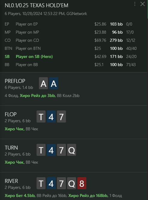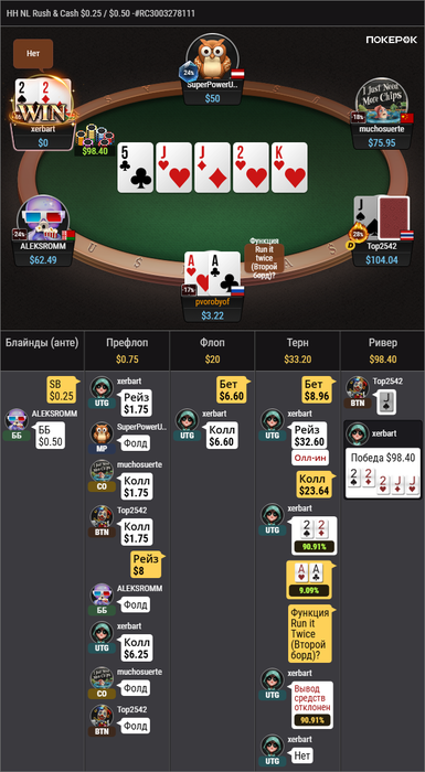 2.2) В том-то и прикол, что пуш выглядит более простым действием без особой просадки по евшке, но я подумал так будет проще получить оплату от мутанта с нл25 и отскочить за дешево против фулов старше, так как я сомневаюсь в их способности превращать три пары в блеф.