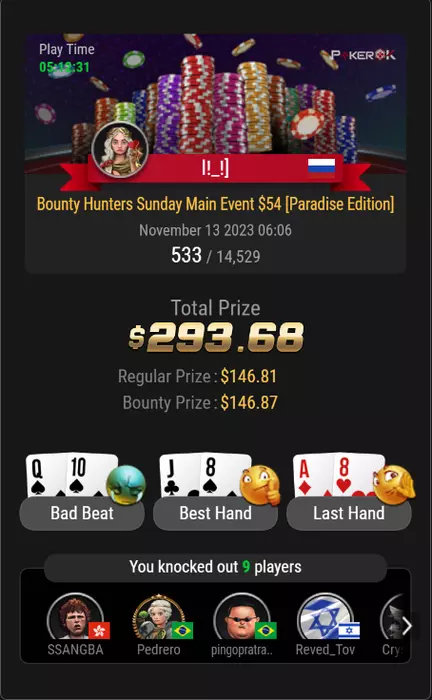 И скорей всего этот блеф довольно плох по всем параметрам: и блефы блокируем, и за меня довольно жирное баунти, что расширяет его колл, и оддсы для него будут неплохими, но чуйка, мать ее, не подвела. В общем, получив нехилый такой буст к морали и фишкам, я попал на финалку с хорошим стеком. Но на финалке включился такой жесткий карддэд, что я даже с баттона не мог открыть в большинстве случаев и закономерно вылетел шестым. Но эмоций этот турик подарил целый спектр