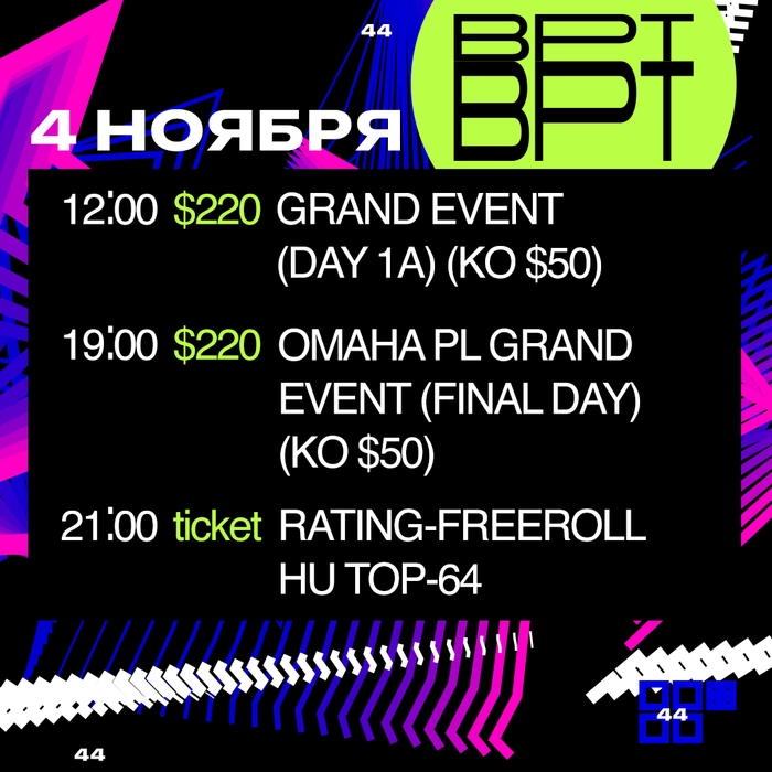 В 12:00 начнется $220 Grand event (day 1A). Это трехдневный мейджер в формате обычного нокаута, награда за выбивание — $50. В первом входном дне сыграем 16 уровней, 12 из которых будет доступна поздняя регистрация. Закончим игру около 20:45.