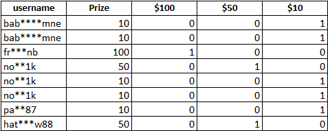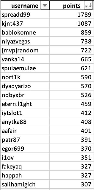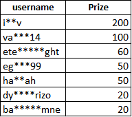 Результаты лотереи на 500 среди занявших 3-20 места турнирного лидерборда