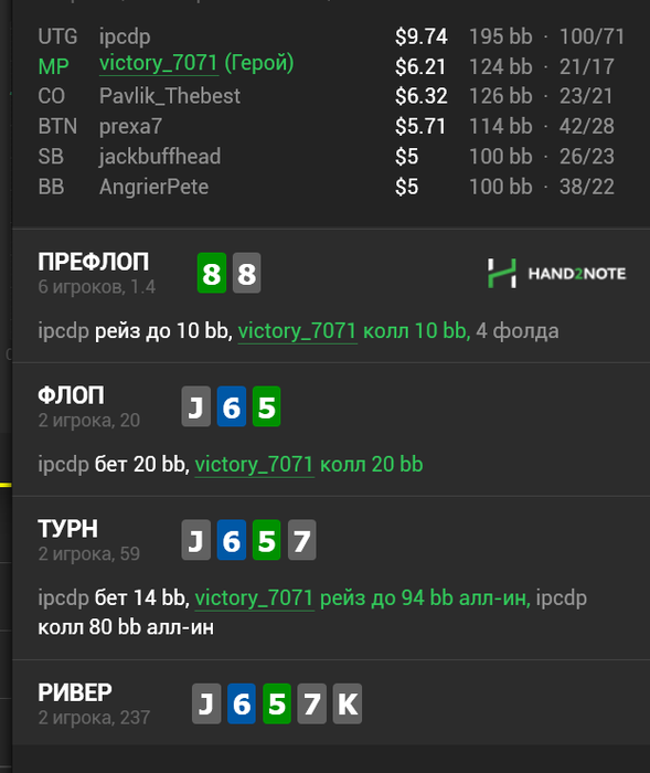 *Флоп зацепил крайне мало. Вот на флопе АИ смотрелся лучше. Пока вы в широких диапазонах, и эквити твоей руки ещё что то стоит. Например зацепить АК-AQos, но без инфы - ПБ именно ООП - это сила. ИП - да, могут лупить без разбора, т.к. ИП и проще это делать. ООП к ПБ без информации нужно относиться крайне аккуратно, даже когда сидит крайне агрессивный соперник. Но если это маньяк 100%, то АИ изи. Выкинет - отлично, попадем в куллер - бывает, можем захватить при этом какие то ШДВ по типу 6х 5х и выше описанные оверкарты.