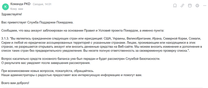 Здравствуйте, заблокировали аккаунт в покердоме, никаких правил не нарушал, мой личный аккаунт, загрузил все документы, решил вывести деньги и аккаунт заблочили, даже зайти не могу, оч переживаю по этому поводу и переживаю о сохранности моих денег на аккаунте, помогите !