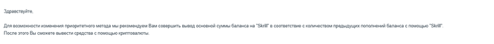 Сделал депозит через УСДТТРК20 50$, через 4 дня сделал депозит через Skrill 67$, еще через 4 дня поставил впервые на вывод на УСДТТРК20 90$(успешно), через 6 дней депаю со Skrill 115$ и через 3 дня снова УСПЕШНО вывожу на УСДТТРК20, - казалось метод УСДТ привязан все хорошо и исправно работает, но как только начал выводить крупные суммы 420$ и 577$, начали возвращать на баланс все запросы на вывод УСДТТРК20, пытался решить с поддержкой вопрос(ниже скрин переписки), никакого внятного ответа я от них не получил, почему я не могу вывести на УСДТТРК20.