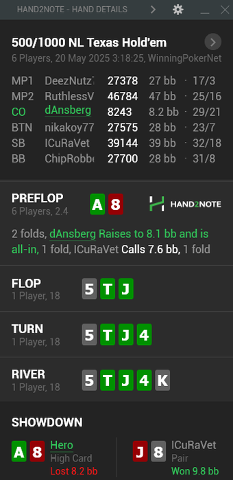 По постфлопу: у меня же еще в диапе 3-бета вся десятая разномастная и в теории я бы с любую Tx с трефой пихнул бы так же в такой линии. Может запарюсь, посчитаю комбы (надл же когда-то учиться этому). Но там чел даже не задумывался над раздачей, просто снеп. Я ещё пушнул, потому что его линия показалась слабой и он капнулся на короля. Поправьте, если не прав: у него есть же есть донк/блокбет на тёрне и проб на ривере. Если бы я сдался, он бы получаеться не добрал в моём диапозоне с A8s - A6s и королей слабее.