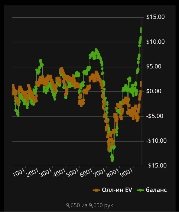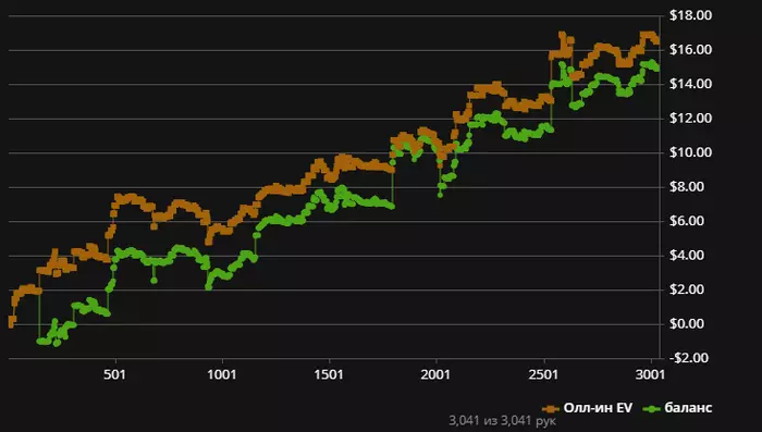 График за 2 дня: Вроде бы ничего примечательного, но фишка в том, что в кассе оставался 1 БИ. Может быть подобрал диапазоны, не знаю посмотрим, дистанция пока никакая.