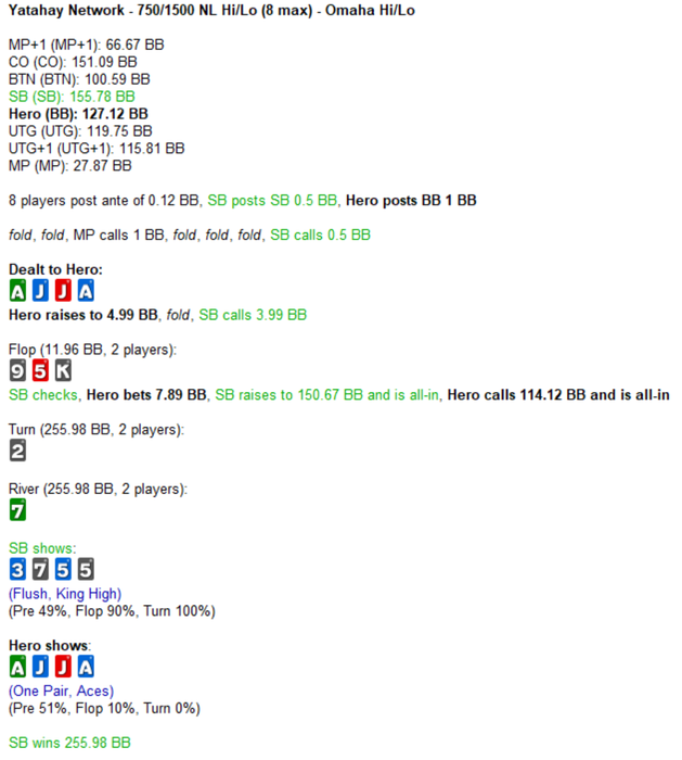 Я не вылетел в этой раздаче, я же написал два раза что у меня был большой стек: "у меня много фишек было в стеке", "имея больше фишек?"
