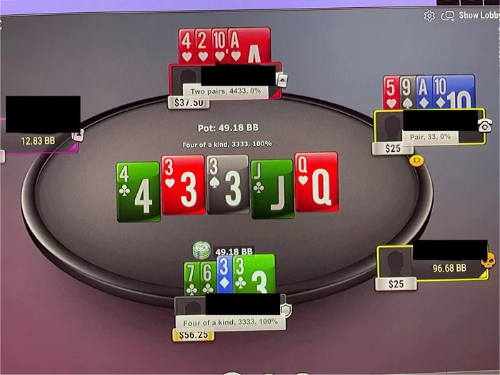 После этого мне заходил один мусор, на постфлопе ничего не собиралось и стек растаял до 5,7 бб. Пришлось пушить J5)J4 и вдруг я получаю 1, 2, 3, ЧЕТЫРЕ олл-ина 😯😯😯 Выигрываю хай банк и апаю 30 бб 🙃