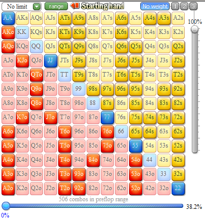 Вот как выглядит мой спектр открытия с одной из позиций (не могу говорить какой, т.к. маньяки солвера заэксплойтят, я же всё ещё игрок (играющий тренер практически).