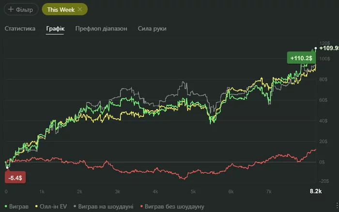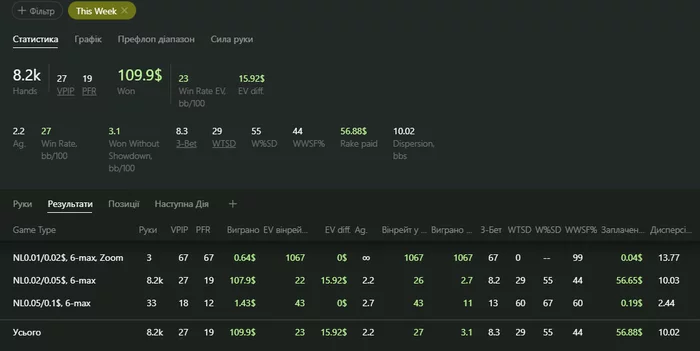 Переосмыслил свою игру, немного разобрал её и понял, что ошибок было просто море — начиная с префлопа. В последние два дня я старался играть свою игру и смог вытащить EV из минуса. Но по факту на NL5 всё равно остался в небольшом минусе.