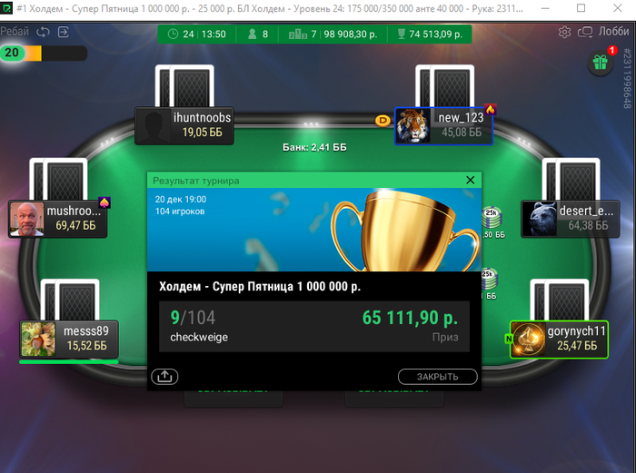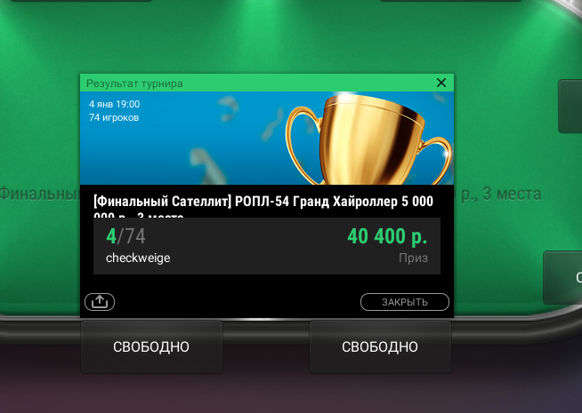 Выиграл турнир с саталита Артпокера. Призовые 303 к . Снял себе на расходы часть . По факту плюсую к банкроллу 227.5к