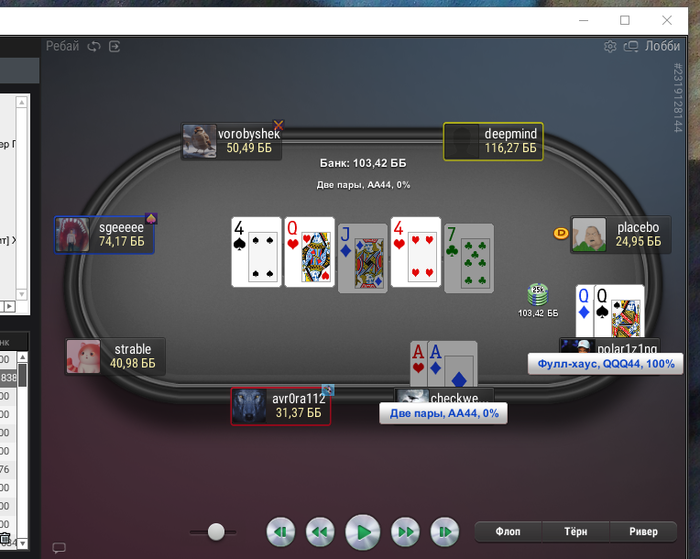 брал небольшой перерыв . сыграл свой билетик на 25 к . на бабле предфиналки не повезло на 15 бб сб в бб мои A6 проиграли k5 оппоненту