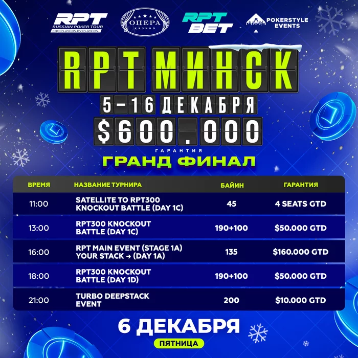 ❇️ В 13:00 и в 18:00 сыграем ещё два флайта $290 RPT300 KNOCKOUT BATTLE ($50 000 GTD). День 1С будет с 25-минутными уровнями, 1D — с 15-минутными. Поздняя регистрация 12 уровней, оба входных дня играем до ИТМ (10% участников). Награда за выбивание $100. Финальный день будем играть в субботу в 11:00. Финал турнира будет показан в ТВ-трансляции с открытыми картами. 📺
