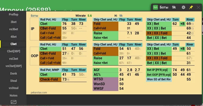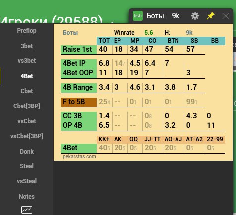 Переходим ко второй части программы. Не нужно обладать высокой скиллухой, чтобы заметить, что боты катают с разогнанной агрой, за это и нужно наказывать. На данный момент посчитали только префлоп, как будет постфлоп - поделюсь)