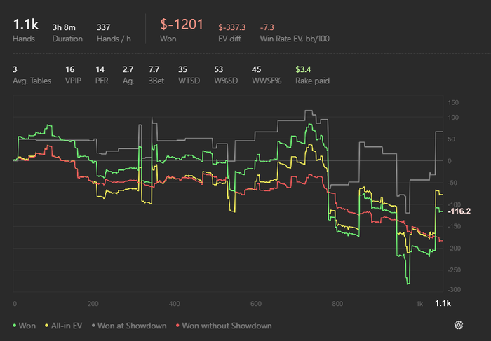 Сегодня так.Сдавали не очень.Упоролся с ДД в АА бб вс бу от типа ,который стилит при любой возможности и на 3бет инста 4бетит,как обычно.Потом с АА упоролся в допер.Ну и блефы сегодня не проходили.По кассе -5$.