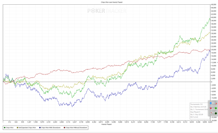 Освоился на лимите 2$ играя в конце на двух столах, показал почти 70 чипов, было принято волевое решение пощупать пятерки на двух столах, думал буду играть чуть ниже чипы как-нибудь освоюсь)))