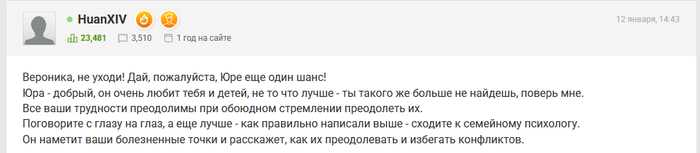 Дружище, да так-то похуй глубоко на саму историю. Темы ты вначале обозначил интересные про взаимоотношения полов, но подход выбрал, как бы это сказать, ублюдский. Под маской ноунейма оскорблять известных юзеров форума, используя факты из их личной жизни... не по-мужски как-то. Так что решил обозначить для тех, кто случайно сюда забредёт и начнёт читать не сначала, чтобы слишком серьёзно не воспринимали.