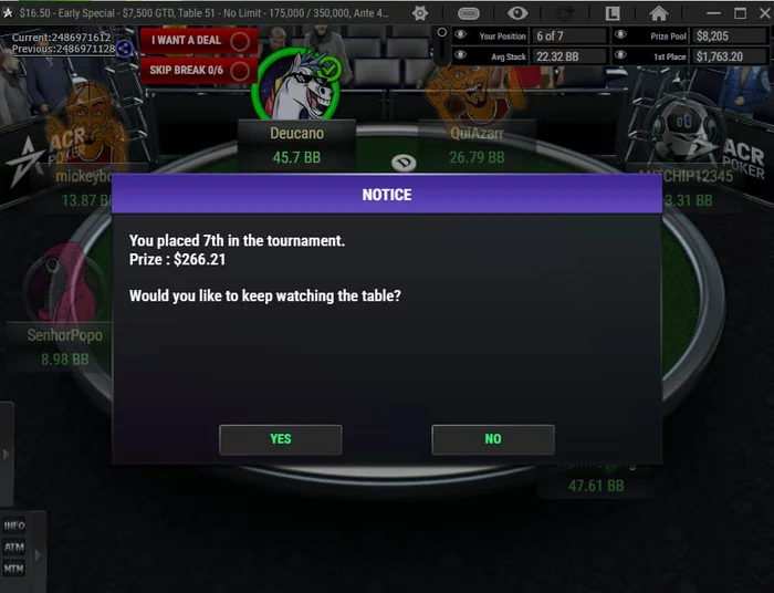 Еще не всегда удается правильно идентифицировать спортсменов. Один покемон сидел нитом с 19/13, открылся из утг, а у меня на большом блайнде AQo. Решил не трибетить, сыграть от колла. В итоге спортсмен забрал банк со стритом с 98о, а я забрал бибу с топ-парой и сильным кикером. Написал в нотсах, что открывашки чела не достойны уважения, но вообще не факт, что еще увижу его за столами. На этой позитивной ноте завершаю повествование.