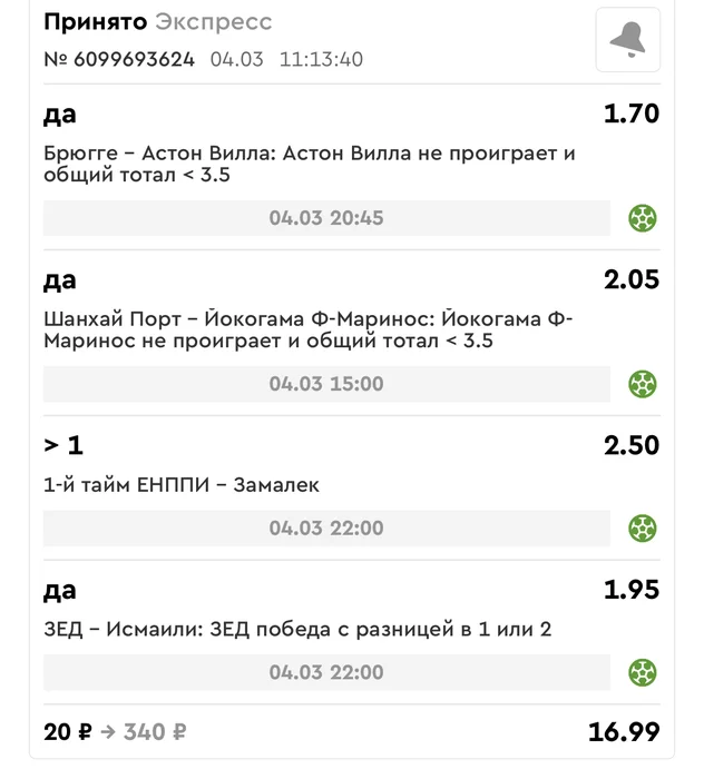 Экспрессы х10+ все проиграли. банк похудел на 60₽. Банк -8,4%.Итого банк 4560 ₽. Экспрессы на 04.03.25. Экспресс 8 -0,33 флета, экспресс исх+тот +0,05 флета, экспресс тотал -2,88 флета.