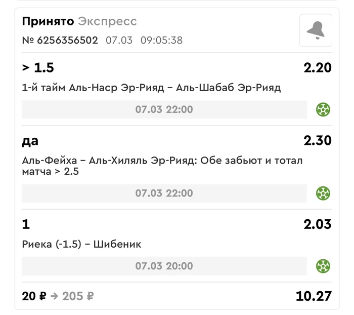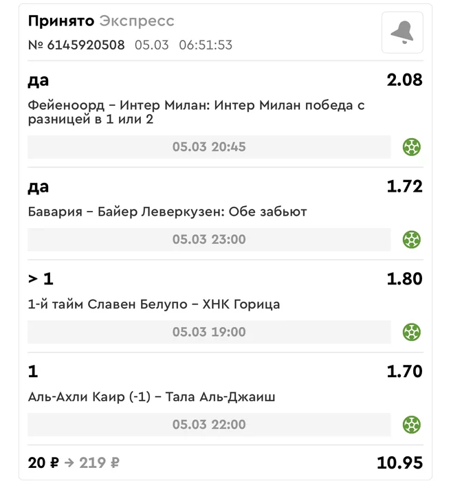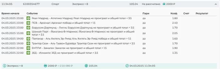 Экспрессы х10+ все проиграли. банк похудел на 60₽. Банк -9,6%.Итого банк 4500 ₽. Экспрессы на 05.03.25. Экспресс 8 -1,83 флета, экспресс исх+тот +2,2 флета, экспресс тотал -3,86 флета.