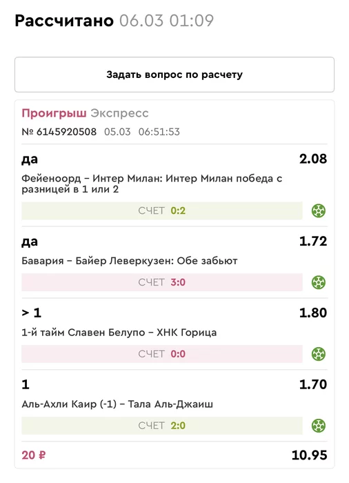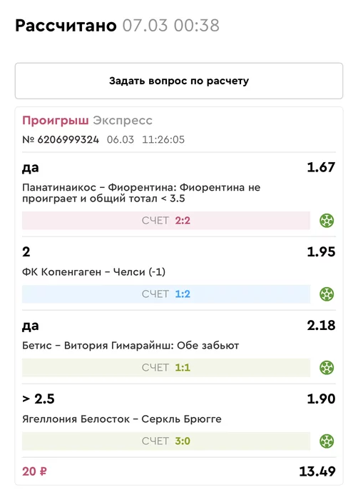 Экспрессы х10+ все проиграли, кроме исх+тот, он полноценно выиграл без возвратов. банк ПОТОЛСТЕЛ КАРЛ!! на 154₽. Банк -6.92%.Итого банк 4654 ₽. Экспрессы на 06.03.25. Экспресс 8 -2,05 флета, экспресс исх+тот +4,56 флета, экспресс тотал -5,04 флета.