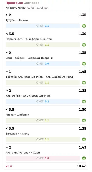 Проигрыш всех экспрессов 07.03.25 - 6 000 р, догонов не было . Прибыль за год по экспрессам 21200р, за МАРТ -42000 р. По догонам с начала года наша прибыль составляет 231 530 р, за март по сегодняшний день по догонам наша прибыль составляет +6930 р. Таким образом с начала года наша общая прибыль +270 930 р, прибыль за март -35070 р! Экспрессы на сегодня 08.03.25.
