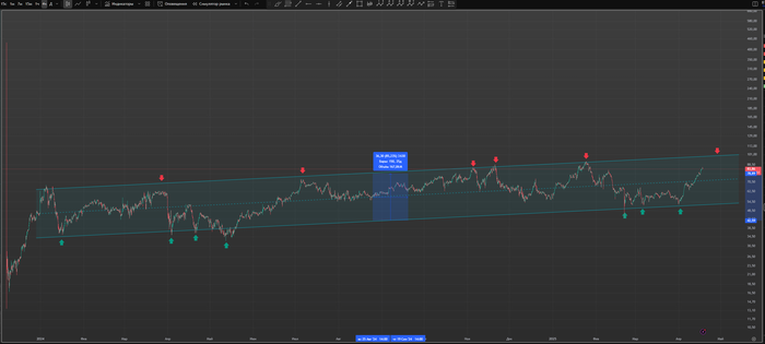 П.С. Спред на короткое время вышел из канала на фоне негативного принятия рынком пошлин, веденных Трампом. Но очень быстро вернулся обратно в канал при смягчении его риторики.