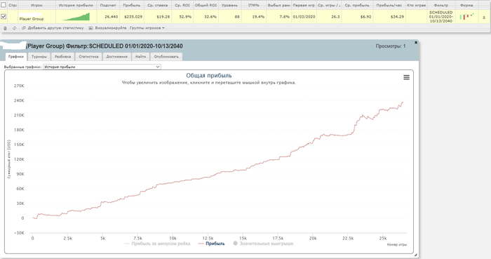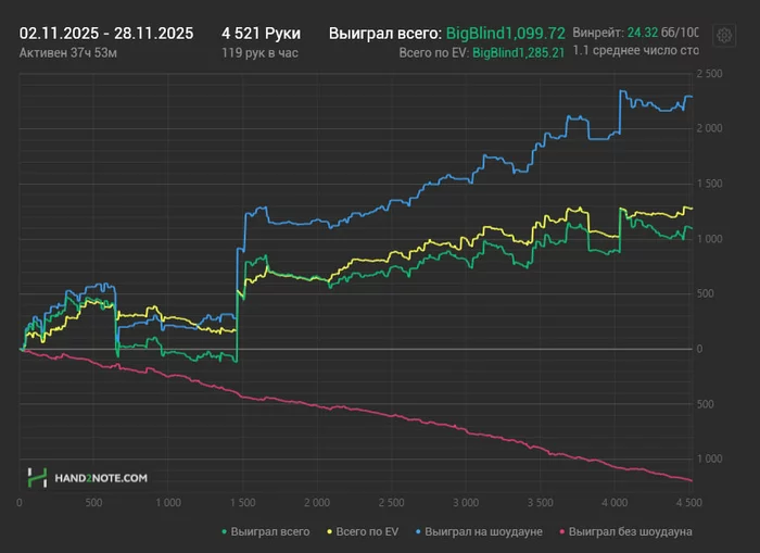 6. "Ты в минусе, так еще и увеличиваешь столы, дурачок" могли бы сказать некоторые, что звучит логично, если бы не один нюанс. Я долгое время играл вообще без какой-либо аналитики, но Марго помогла с доступом к H2N, где внезапно выяснилось, что я довольно хорош. Да, мало рук (загрузил не из всех румов); да, тут нужно копать глубже и один лишь график не показателен; да, возможно я переоцениваю себя в рамках этого лимита. Но как не крути, я стал играть лучше, ибо еще в июне (вроде) у меня был график с гордыми "-40 ББ". Очевидный прогресс просматривается.