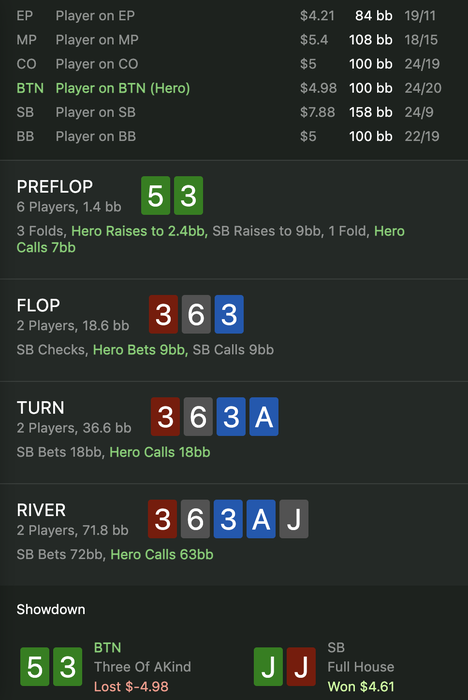 2. Рейк: Из этого пота покерный рум возьмет 5%, что составит $5. Таким образом, вы получите $95.