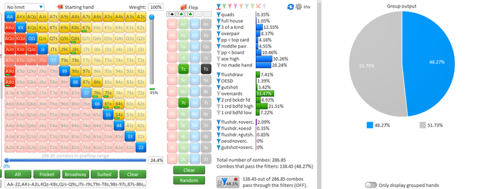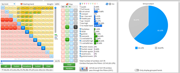 Для тренировки работы во флопзилле выбрана слишком сложная ситуация: мультипот в самых широких спектрах. Проще для начала разбирать что-то лёгкое с узкими ренжами, для опыта. Например 3бет пот в ранних.