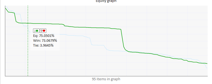 Видим преимущество по эквити у оппа, у нас стрит. Играем аккуратно и ставим пол пота, в нас прилетает all in, считаем шансы банка и выходит что нужно примерно (если округлить в большую сторону) в 30 процентах случаев выигрывать эту раздачу, чтобы колл был плюсовый. То есть по эквити мы проходим. Давайте глянем какие руки оппонента нас бьют, это каре, фулл хаусы, и Q9, (она у меня не в полном весе, но даже если в полном, то прибавляется немного)