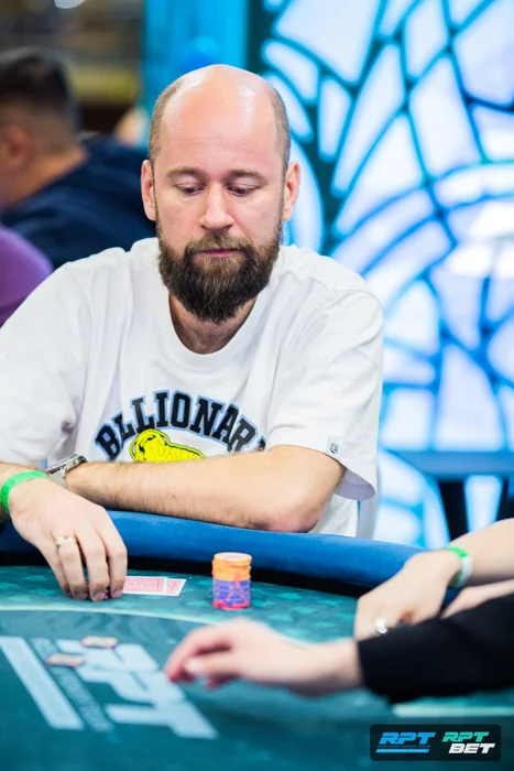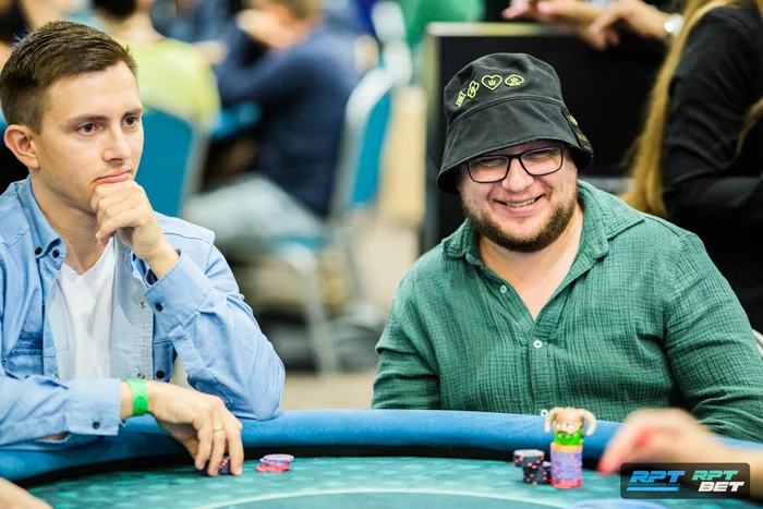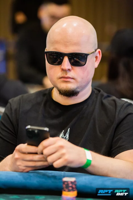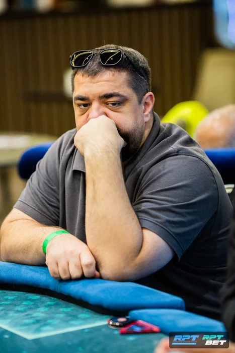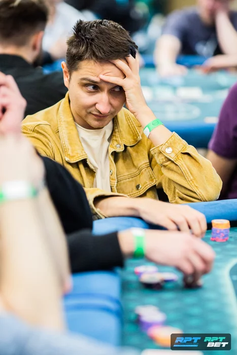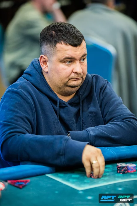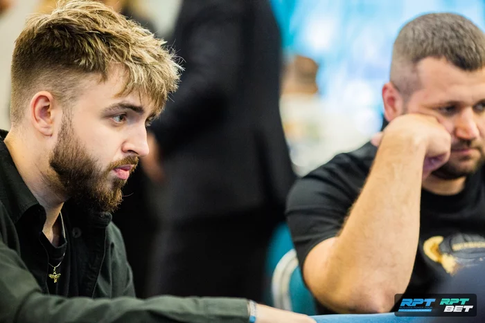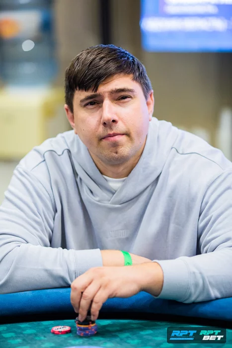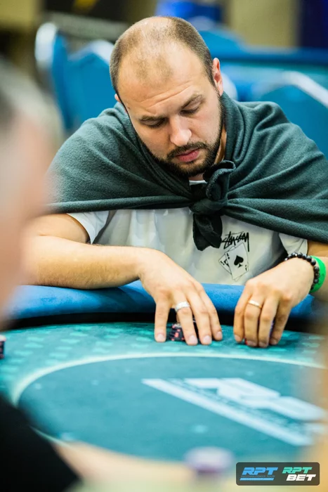 Евгений Болокан выбывает из флайта 1С. Проиграл префлоп выставление на небольшой стек около 9бб с против Дениса Морозова.