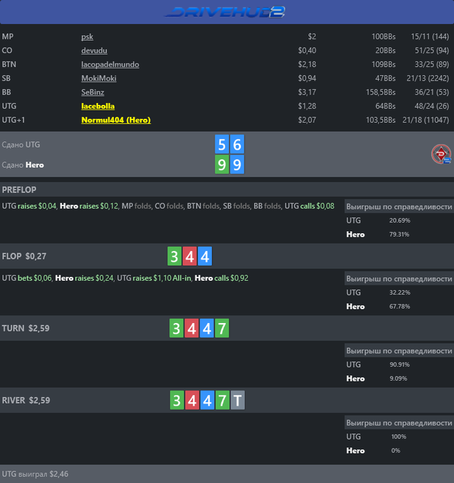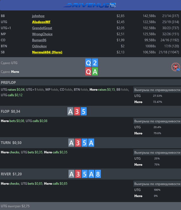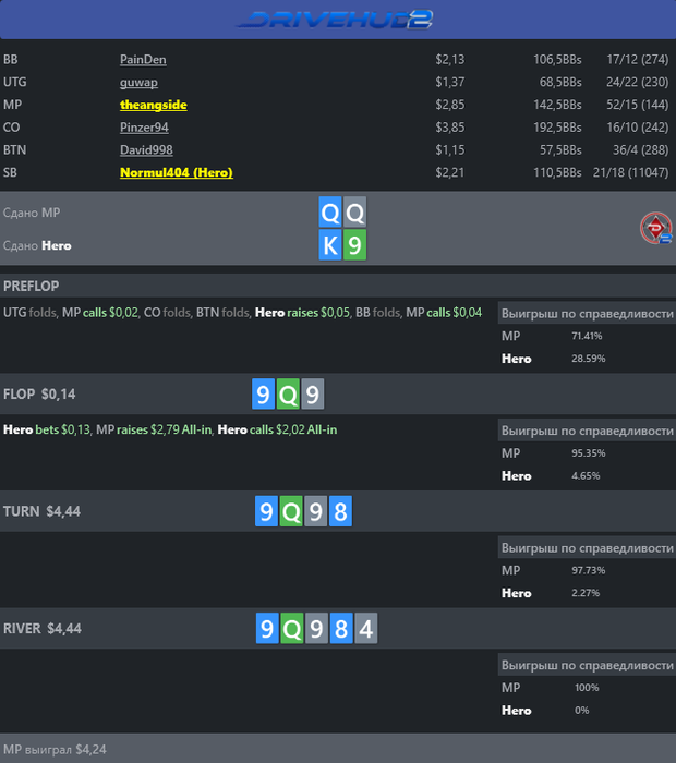 Kazrich, в раздаче с туз валет я не поверил в сэт, скорее в ФД младше или пару 9. Потому посчитал, что по шансам просто колл, в теории так могли ещё 78пик сыграть. В раздаче с туз дамой по терну ушел в чек, чтобы кроме ставок от тузов младше собрать ещё и флоаты от покетов, своей ставкой терном я их мог выбить. По флопу занизил сайзинг,чтобы оставить в диапазоне опа побольше карманок, возможно стоило играть чек - пуш терн🤔?