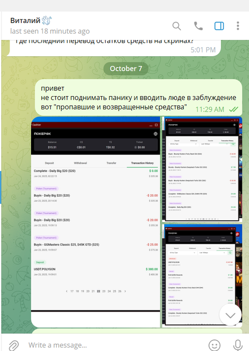 Следующий факт. 7 октября предоставлены скриншоты в таком виде как меня попросил Виталий (т е за определенные даты от момента поступления средств в рум до момента вывода остатка)