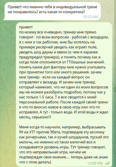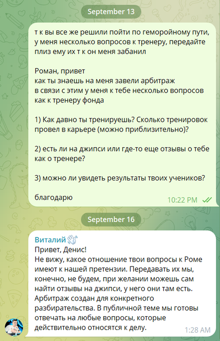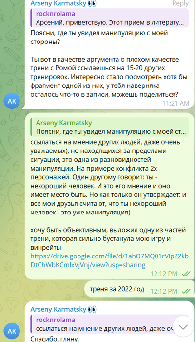 Мы обсуждали этот вопрос в тг-группе достаточно подробно. Арсений даже запросил записи моих частных тренировок, которые я считаю качественными и очень полезными. После того, как я отправил фрагмент такой тренировки... Чувак, ты просто слился и не в каких обсуждениях далее не участвовал. Надеюсь тебе хотя бы стало стыдно. Если конечно такое чувство есть в арсенале лжеца и мошенника.
