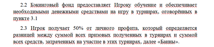 И это действительно важный момент. У нас есть договор. В нем нет ни одного намека на то, что я должен отыгрывать мейк без финансированияи играть определенное кол-во турниров И это факт. Договор я подписывал таким какой он есть. Если у фонда есть другое мнения по вопросу - прошу предоставить публично соответствующие скрины договора.