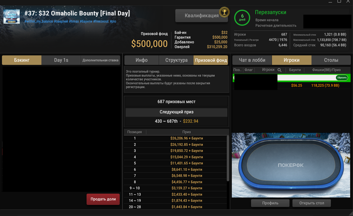 Получилось раза три отобраться на финальную фазу по 32, текущий стек 73бб