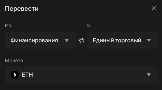 Далее переводим деньги из счета "финансирование" на счет "единый торговый"