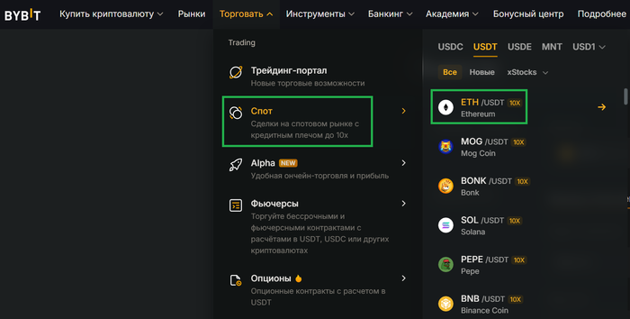 Открываем торговлю спотом (сделки в режиме реального времени), мне нужно продать ЕTH купить USDT: