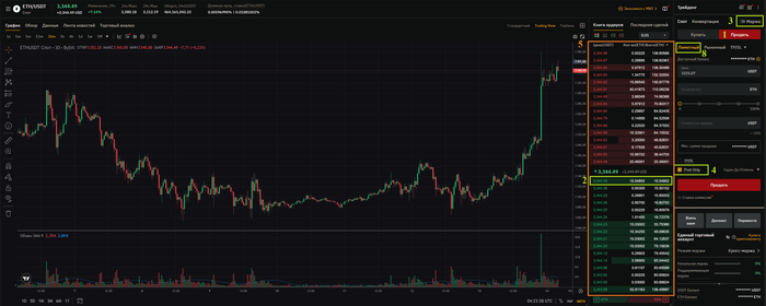 Поэтому при создании ордера с post-only, нужно ставить цену лучше чем в стакане, чтобы ваш ордер встал в стакан, иначе он будет отменяться. Допустим текущая лучшая цена продажи ЕTH по скриншоту 3337,68 usdt, ставим в ордере например 3338 или 3339. Если на момент создания нашего ордера, такая цена появится в стакане, то наш ордер моментально отмениться.