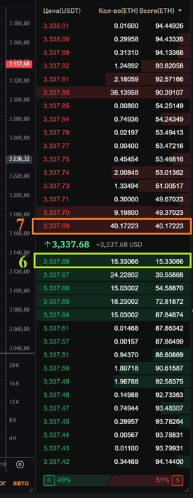5. Смотрим другую картинку, 6 это лучшая заявка покупающая ЕTH за USDT, 7 это лучшая заявка продающая еth за usdt. На 6 мы в конце сделки получим USDT, а на 7 получим ЕTH.