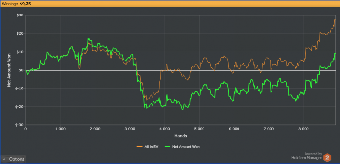 долго думал, какую бы поставить ставку, чтобы он ну уж точно выкинул, в итоге понял, что спалился, потому что долго думаю, и отдал ему банк =)))) На терне не ставил, т.к. с