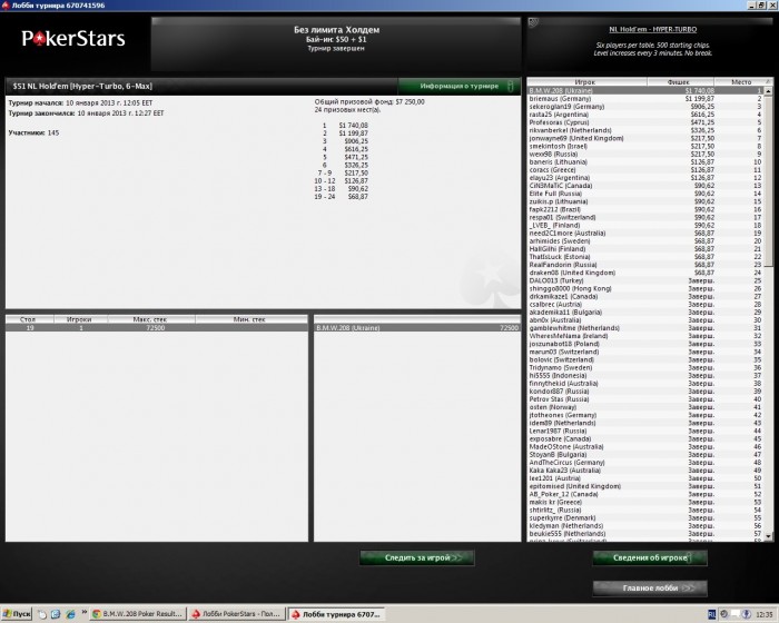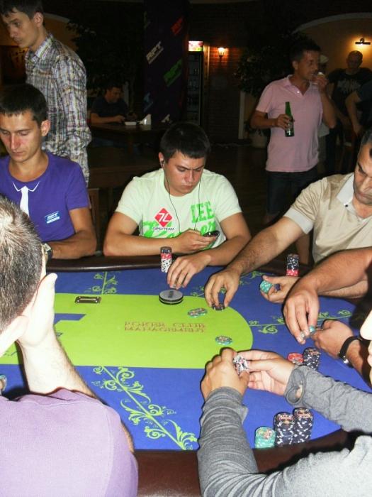 И еще была интересная раздача. Я с на баттоне. Блайнды вроде 50-100. 4 лимп-колла перед мной. Я также колл. В банке 700 фишек. Флоп . Со MP бет 500. Я рейз 1000. Все пас. MP колл. Терн . MP чек. Я бет 1000. Он олл-ин. Я думал, думал, но никак не давал ему флеш. Я заколил его олл-ин. Он показал сет двоек. Ривер бланк. И я удвоился.