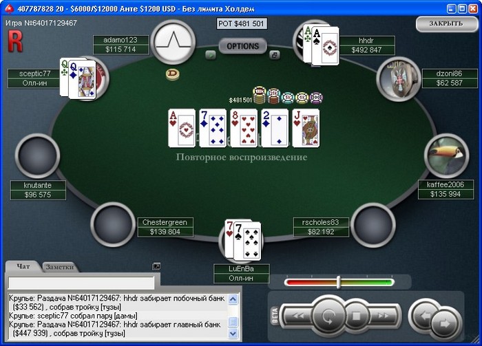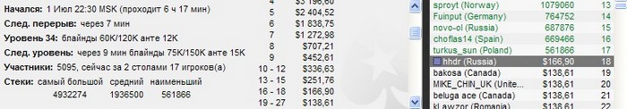 Ну да, примерно так. А говоря о неадекватности некоторых я вот что имел ввиду - там были типы, которые меня постоянно удваивали, под конец я спрашиваю - "ну ты тупой что-ли? не видешь, что я пихаю QQ+?" Не, мне нормально, но продолжалось так - он рейс 2-3бб с МБ, я пуш, он кол. Я КК АА QQ, он K2о, Q5, A4/ И типа рег с ABI 50 Там сплошняком такие перцы.